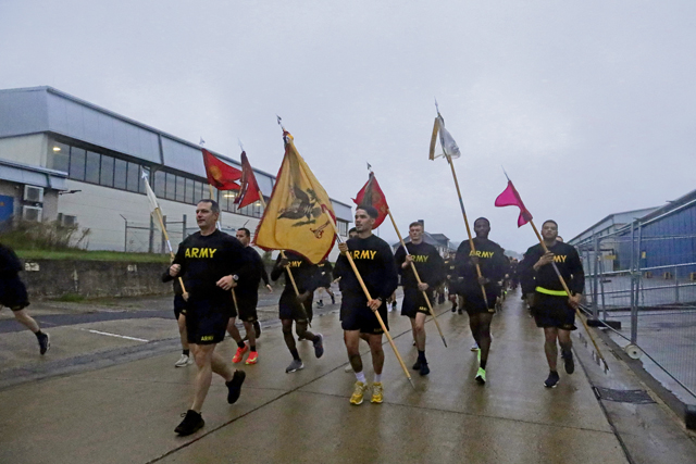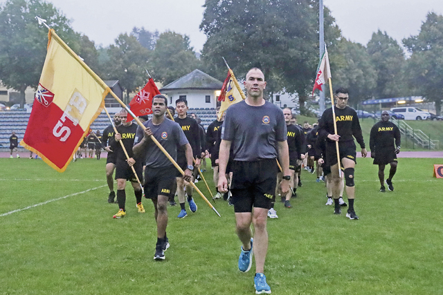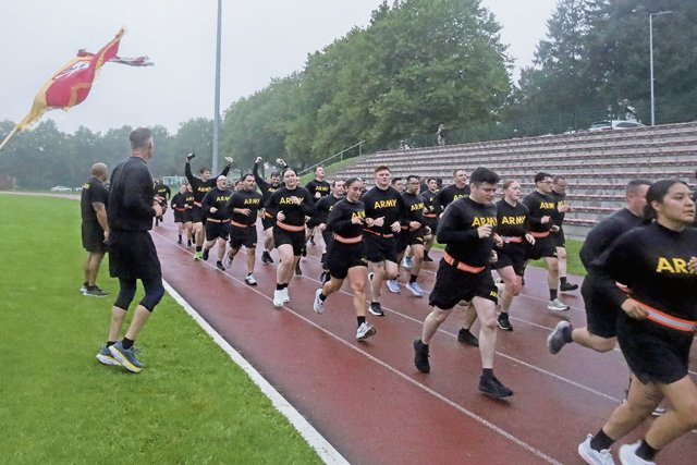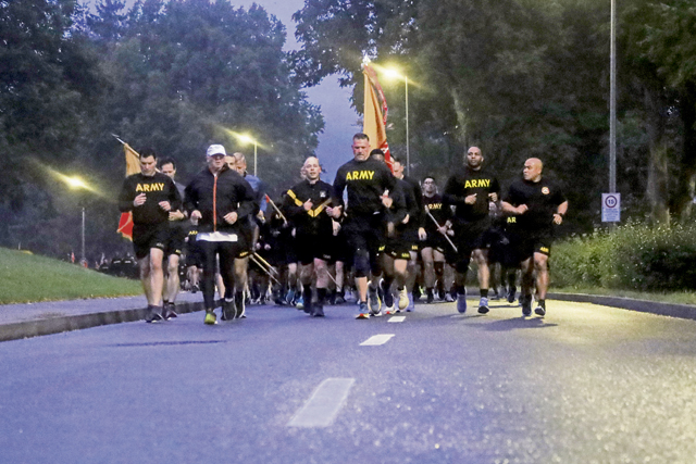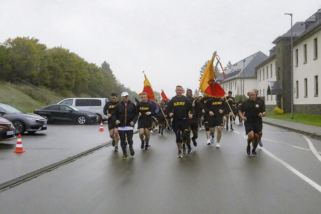 Lt. Col. James Seale, commander, 95th Combat Sustainment Support Battalion- Warhorse Herd, leads Soldiers of his formation in a 16th SB hosted 9/11 remembrance run which brought together fellow units stationed at Smith Barracks located in Baumholder, Germany.