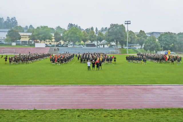 U.S. Army units from across smith Barracks stand together in solidarity on Minick Field, Smith Barracks, Baumholder Germany, following participation in a 9/11 remembrance run hosted by the 16th Sustainment Brigade. The run was held to pay respects to those that lost their lives in attacks on our nation 24 years prior.