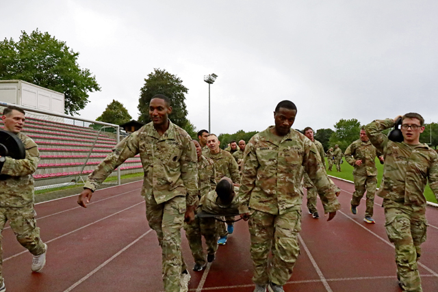 Soldiers of the 16th Sustainment (Knights) Brigade, assisted by team member, Michael B. Lalor, commanding general of the 21st Theater Sustainment Command, transport equipment and a fellow group member by medical litter, along a fitness track located at Minick Field on Baumholder while participating in the Ghost Rider Gauntlet physical training exercise, hosted by the 40th Transportation Company at Smith Barracks in Baumholder, Germany, Sept. 12, 2025.