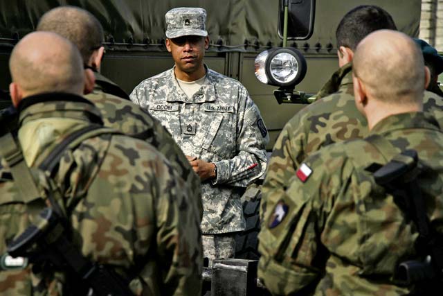 U.S. Army soldiers Chief Warrant Officer 3 Sulaimen Bah, supply system technician, Sgt. 1st Class Charles Odom, senior wheeled vehicle mechanic, and 1st Lt. Henry Chan conducted classes teaching the Polish troops cargo preparation techniques, mechanical inspections, hazardous material documentation, U.S. Customs inspections, and aerial and ground transportation operations.