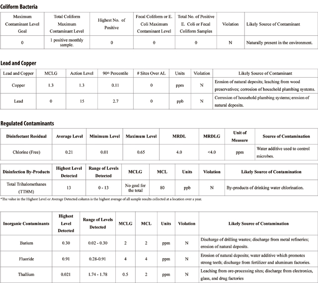 The tables list all drinking water contaminants detected during the calendar year of this report. Although more than 90 contaminants were tested, only those substances listed were detected in our water. All sources of drinking water contain some naturally occurring contaminants. The FGS requires us to monitor for certain contaminants less than once per year because the concentrations of these contaminants do not vary significantly from year to year, or the system is not considered vulnerable to this type of contamination.