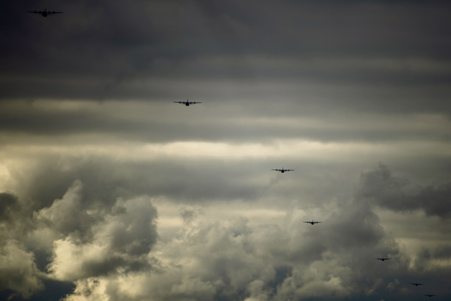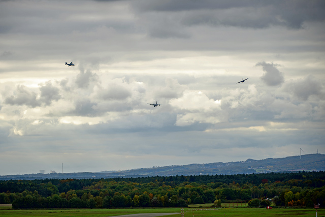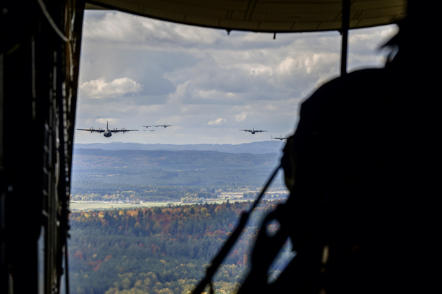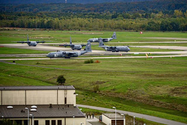 U.S. Air Force C-130J Super Hercules aircraft return to base for maximum generation at Ramstein Air Base, Oct. 15. Maximum generation is a demonstration that showcased Ramstein’s rapid ability to execute airlift missions across multiple theaters. Photo by Maj Derek Brockmann