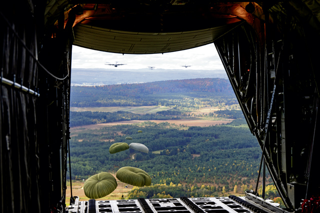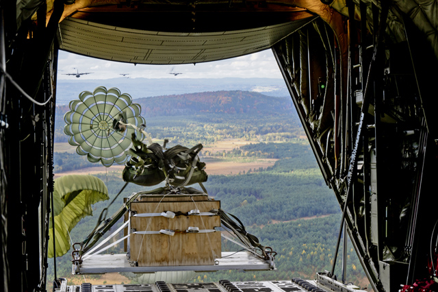 U.S. Air Force C-130J Super Hercules aircraft fly in formation and drop cargo during a maximum generation exercise at Ramstein Air Base, Oct. 15. During a max gen exercise, all available aircraft are employed to prepare pilots for a mass event when called upon, demonstrating lethality and readiness in a variety of contingency scenarios. Photo by Senior Airman Trevor Calvert