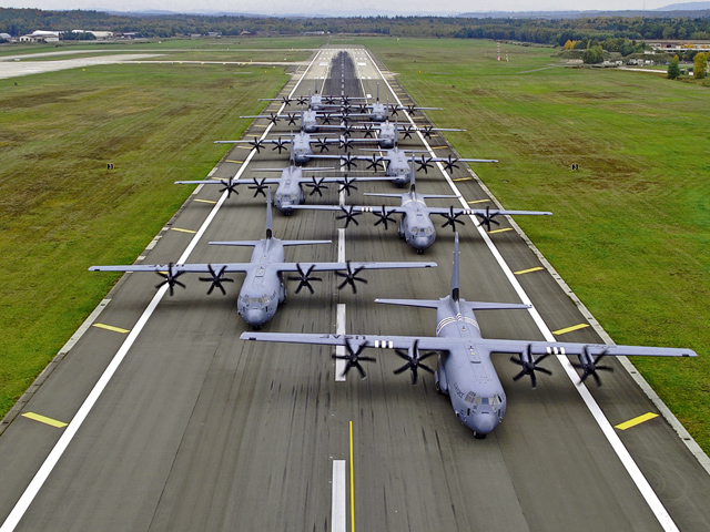 U.S. Air Force C-130J Super Hercules aircraft return to base for a maximum generation exercise at Ramstein Air Base, Oct. 15. Maximum generation is an exercise which demonstrated the Air Force’s rapid ability to generate airpower and execute airlift missions. Photo by Senior Airman Vaughn Weber