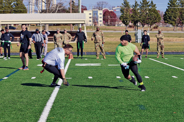 1st Sgt. Christopher D. Holmstadt, the senior enlisted leader for the 20th CBRNE Command Headquarters and Headquarters Company, said Spc. Keon Forbes saved the game for the Defenders with an end zone interception that led to their winning score.