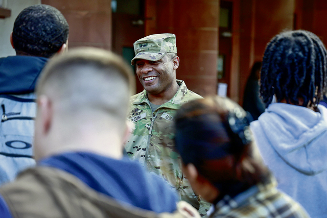 .U.S. Army Maj. Gen. Ronald Ragin, commanding general, 21st Theater Sustainment Command, speaks to Soldiers and families at the 21st Special Troops Battalion Eggstravaganza event on Panzer Kaserne, Kaiserslautern, Germany, on April 4, 2024. The Eggstravaganza is an annual event for Service Members, DoD civilians, and their families to play games, enjoy food and participate in multiple events. (U.S. Army photo by Spc. Samuel Signor)