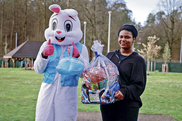 .Madison Boodram poses with the Easter Bunny after she was declared the winner for the adult iteration of the Easter egg hunt at the 21st Special Troops Battalion Eggstravaganza at Panzer Kaserne, Kaiserslautern, Germany, on April 4, 2024. The Eggstravaganza is an annual event for Service Members, DoD civilians, and their families to play games, enjoy food, and participate in multiple events. (U.S. Army photo by Spc. Samuel Signor)