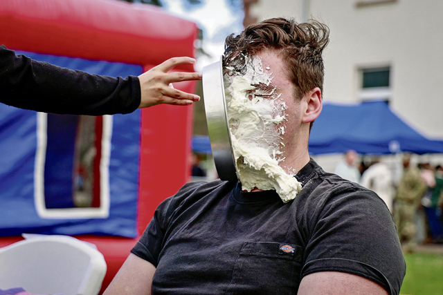 U.S. Army Spc. Darius Norris, intelligence analyst, G2, 21st Theater Sustainment Command, gets a pie thrown in his face at the 21st Special Troops Battalion Eggstravaganza on Panzer Kaserne, Kaiserslautern, Germany, on April 4, 2024. The Eggstravaganza is an annual event for Service Members, DoD civilians, and their families to play games, enjoy food and participate in multiple events. (U.S. Army photo by Spc. Samuel Signor)