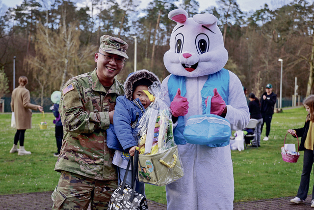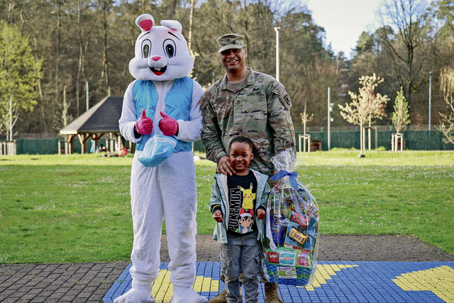 .U.S. Army Staff Sgt. Ira Jackson, senior human resources non-commissioned officer, 21st Theater Sustainment Command, poses with his son, Remi, and the Easter bunny after his son was declared the winner for the second iteration of the Easter egg hunt at the 21st Special Troops Battalion Eggstravaganza at Panzer Kaserne, Kaiserslautern, Germany, on April 4, 2024. The Eggstravaganza is an annual event for Service Members, DoD civilians, and their families to play games, enjoy food, and participate in multiple events. (U.S. Army photo by Spc. Samuel Signor)