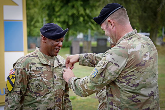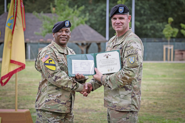 U.S. Army Command Sgt. Maj. Alvin Porch, outgoing senior enlisted advisor of the 21st Special Troops Battalion, receives a meritorious service medal from Col. Chad Juhlin, commander of the 21st STB, for his service and dedication to the unit while he was their senior enlisted advisor, at the relinquishment of responsibility ceremony on Panzer Field, Kaiserslautern on July 28. The ceremony was held for Porch to relinquish his responsibility over the 21st STB as his European tour has come to a close. Photos by Spc. Samuel Signor