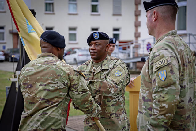 U.S. Army Command Sgt. Maj. Alvin Porch, outgoing senior enlisted advisor of the 21st Special Troops Battalion, is handed the battalion guidon by 1st Sgt. Willie Cole, senior enlisted advisor of the headquarters and headquarters command, at the relinquishment of responsibility ceremony on Panzer Field, Kaiserslautern, on July 28.