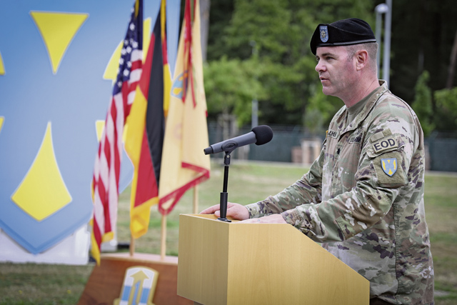 U.S. Army Col. Chad Juhlin, commander of the 21st Special Troops Battlion, gives remarks about Command Sgt. Maj. Alvin Porch, outgoing senior enlisted advisor of the 21st STB, at the relinquishment of responsibility ceremony on Panzer Field, Kaiserslautern, on July 28.