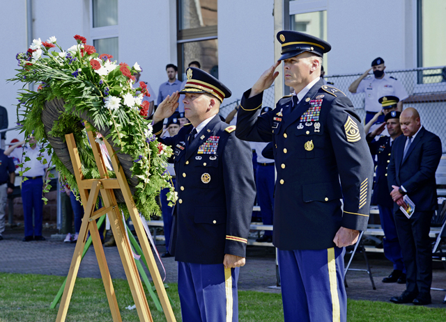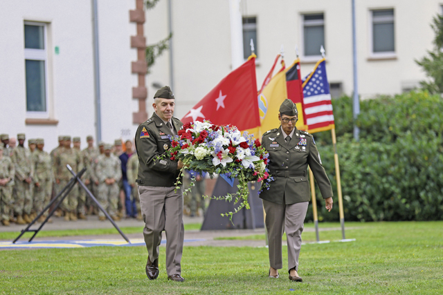 U.S. Army Maj. Gen. Michael Lalor, commanding general of the 21st Theater Sustainment Command, and Command Sgt. Maj. Denice Malave, 21st TSC senior enlisted advisor, carry a memorial wreath during the 21st TSC’s 9/11 remembrance ceremony on Panzer Kaserne, Kaiserslautern, Germany, Sept. 11, 2025. The formal presentation marked the end of the day’s commemorative events. (U.S. Army photo by Spc. Mya Webster)