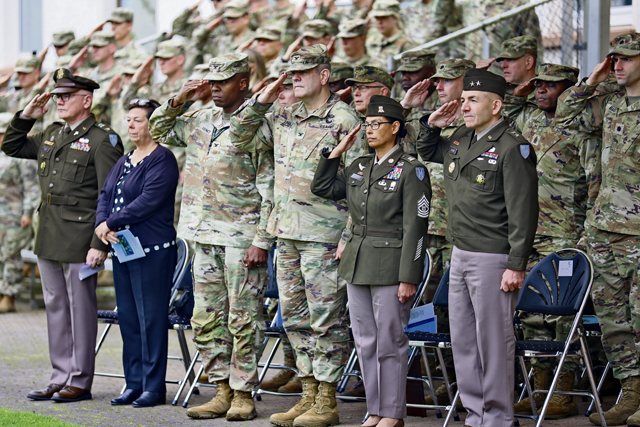 21st Theater Sustainment Command’s command team and members salute during the national anthem at the 21st Theater Sustainment Command’s 9/11 remembrance ceremony on Panzer Kaserne, Kaiserslautern, Germany. Sept. 11, 2025. The salute reflected respect for the victims and reaffirmed their commitment to the nation’s defense. (U.S. Army photo by Spc. Mya Webster)