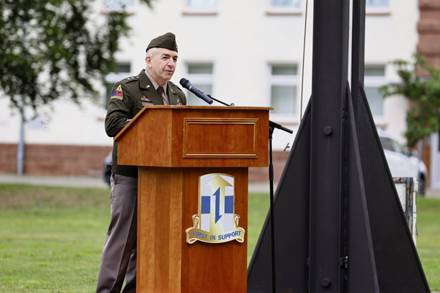 U.S Army Maj. Gen. Michael Lalor, commanding general of the 21st Theater Sustainment Command, speaks during a 9/11 remembrance ceremony on Panzer Kaserne, Kaiserslautern, Germany, Sept. 11, 2025. Lalor encouraged service members to honor the fallen by continuing to uphold the Army’s values and mission. (U.S. Army photo by Spc. Mya Webster)