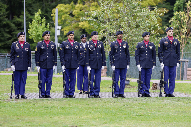 U.S. Army members of the rifle party stand in formation during the 21st Theater Sustainment Command’s 9/11 remembrance ceremony on Panzer Kaserne, Kaiserslautern, Germany, Sept. 11, 2025. The team performed a ceremonial rifle salute to honor the victims of the Sept. 11, 2001, terrorist attacks. (U.S. Army photo by Spc. Mya Webster)