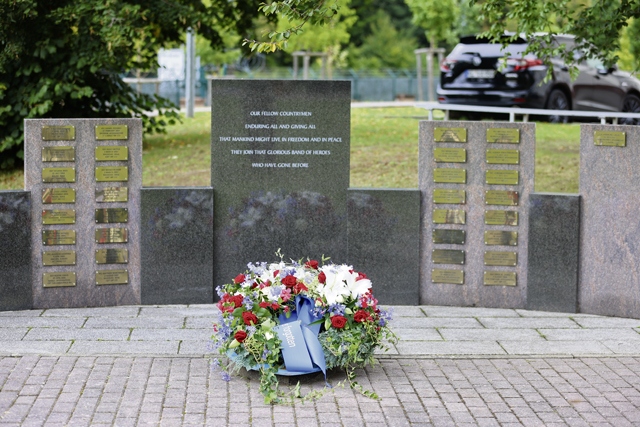 A memorial wreath stands at the Panzer Kaserne monument during the 21st Theater Sustainment Command’s 9/11 remembrance ceremony, Sept. 11, 2025. The ceremony honored the nearly 3,000 lives lost during the Sept. 11, 2001, terrorist attacks. (U.S. Army photo by Spc. Mya Webster)