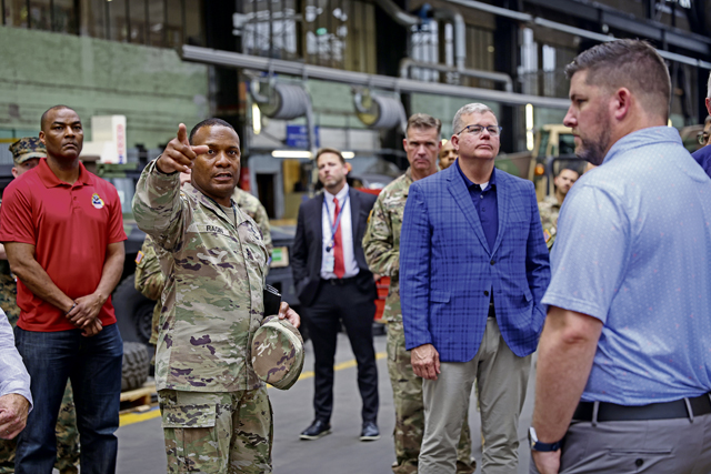 Maj. Gen. Ronald Ragin (left), commanding general, 21st Theater Sustainment Command, points to an M88 Recovery Vehicle during Lt. Gen. Mark Simerly’s (right), director, Defense Logisitics Agency, tour of the Maintenance Activity Kaiserslautern, July 31, 2024. Visits like these strengthen the relationship between the DLA and the 21st TSC and provides a better understanding of the capabilities of the 21st TSC.
