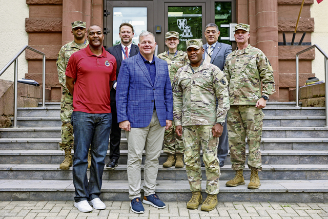 Lt. Gen. Mark Simerly (center-left), director, Defense Logistics Agency, and Maj. Gen. Ronald Ragin (center-right), commanding general, 21st Theater Sustainment Command, pose for a group photo during Simerly’s visit, July 31, 2024, on Panzer-Kaserne. Visits like these strengthen the relationship between the DLA and the 21st TSC and provides a better understanding of the capabilities of the 21st TSC.