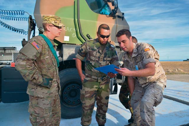 U.S. Army Sgt. Daryl Perez (left), French Petroleum, Oil and Lubrication Cpl. John Parau (center) and Spanish Air Force Pvt. Alejandro Sanudo, all members of Trident Juncture 2015’s modular combined petroleum unit, coordinate exercise logistics Oct. 8 in Zaragoza, Spain. The MCPU fueled vehicles from nearly all of the 35 participating countries during the exercise.