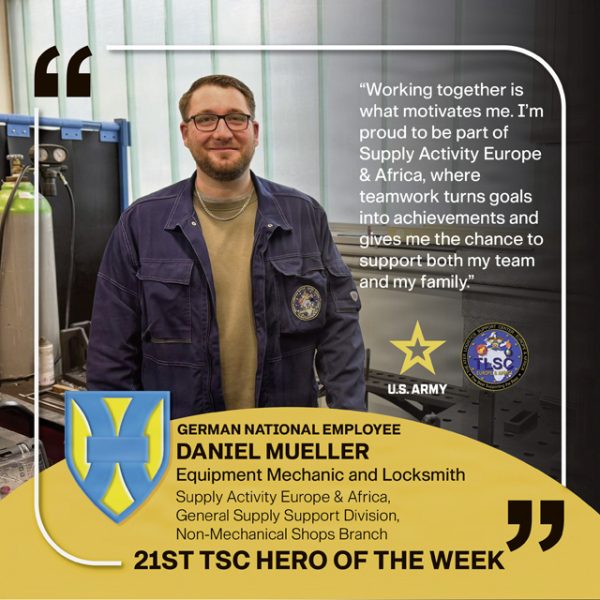 Meet German National Employee Daniel Mueller, an equipment mechanic and locksmith in the Supply Activity Europe & Africa, General Supply Support Division, Non-Mechanical Shops Branch. Mueller is efficient, reliable, and highly experienced in metalwork. He consistently displays helpfulness and friendliness towards team members and external customers. Additionally, Mueller recently assisted in conducting an industrial hygiene survey in the locksmith and welding room, which improved occupational safety and health. By Sarah Ridenour, 21st Theater Sustainment Command