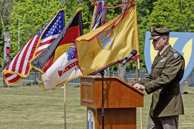U.S. Army Col. Christopher Richardson, chief of staff, 21st Theater Sustainment Command, speaks to the Soldiers, Department of the Army civilians, and special guests during the 21st TSC Memorial Day Ceremony hosted at Panzer Field, on Panzer Kaserne, Germany, May 22, 2025. On Memorial Day, the flag is flown at half-staff from sunrise until noon, then raised briskly to the staff’s top until sunset. (U.S. Army photo by Pvt. Kadence Connors)