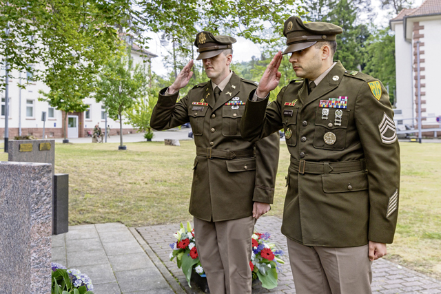 U.S. Army Command Sgt. Maj. Joseph Franco (left), brigade command sergeant major, and Col. Anthony King (right), brigade commander, 30th Medical Brigade, 21st Theater Sustainment Command, render honors during the 21st TSC Memorial Day Ceremony, hosted at Panzer Field on Panzer Kaserne, Kaiserslautern, Germany, May 22, 2025. The ceremony honored the 34 men and women of the 21st Theater Sustainment Command who gave their lives in service to their country. (U.S. Army photo by Pvt. Kadence Connors)