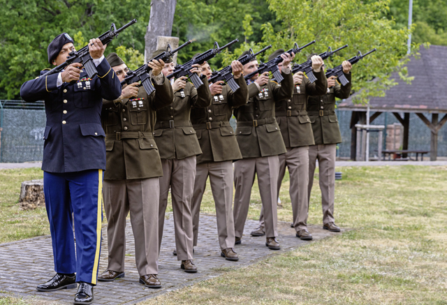 U.S. Army military police officers assigned to 92nd Military Police Company, 709th Military Police Battalion, 18th Military Police Brigade, 21st Theater Sustainment Command, render a 21-gun salute during the 21st TSC Memorial Day Ceremony, hosted at Panzer Field on Panzer Kaserne, Kaiserslautern, Germany, May 22, 2025. The salute honored the 34 fallen service members of the 21st Theater Sustainment Command. (U.S. Army photo by Pvt. Kadence Connors)