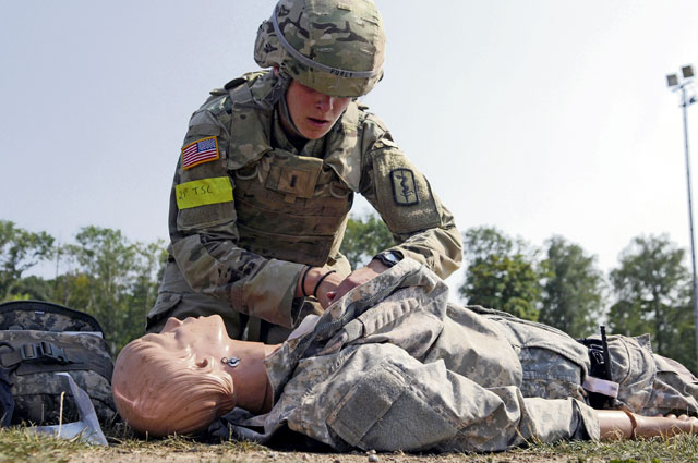 Soldiers from Regional Health Command Europe, 18th Military Police Brigade, and 30th Medical Brigade, among others, tested their medical skills, physical fitness, and basic Soldier tasks during the four-day trial. The competition was split into two teams. One team comprised of competitors from the 30th Medical Brigade and the 21st Theater Sustainment Command, and the other team comprised of competitors from Regional Health Command Europe.