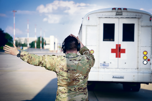 U.S. Air Force Airman guides an ambulance towards the staging area to allow mock casualties to be offloaded from the C-130 and loaded onto the ambulance for further movement at Ramstein Air Base, June 6.