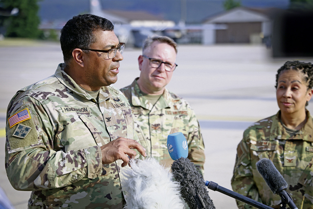 U.S. Army Col. Jordan V. Henderson, commander of 30th Medical Brigade, speaks to the press about the hospital exercise and the importance of training with Allies and Partners on the airfield at Ramstein Air Base, June 6.