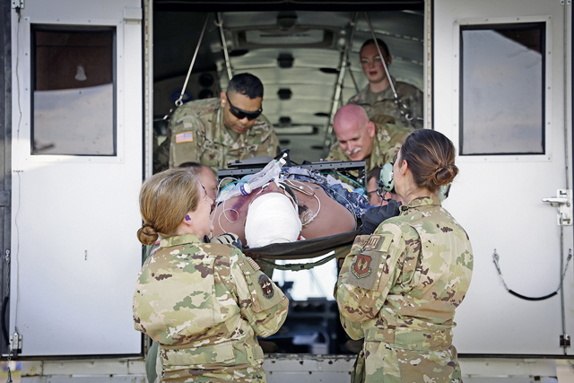U.S. Air Force Airmen and U.S. Army Soldiers offload a mock casualty off of a C-130 and move it to an ambulance for forward movement during a hospital exercise at Ramstein Air Base, June 6. The HOSPEX is a joint, multinational hospital exercise that took place May 22 to June 9, led by the 30th Medical Brigade, 21st Theater Sustainment Command, as the Theatre Medical Mission Command element, in order to evaluate and train deployed medical capabilities. It is part of the DEFENDER 23-linked exercise, Saber Guardian 23. DEFENDER 23 is a U.S. Army Europe and Africa-led exercise focused on the strategic deployment of continental United States-based forces, employment of Army Prepositioned Stocks, and interoperability with Allies and partners. Taking place from April 22 to June 23, DEFENDER 23 demonstrates USAREUR-AF’s ability to aggregate U.S.-based combat power quickly in Eastern Europe, increase lethality of the NATO Alliance through long-distance fires, build unit readiness in a complex joint, multi-national environment, and leverage host nation capabilities to increase USAREUR-AF’s operational reach. DEFENDER 23 includes more than 7,800 U.S. and 15,000 multi-national service members from more than 20 nations who will participate including, but not limited to: Estonia, France, Germany, Greece, Italy, Latvia, Poland, Portugal, Romania, Spain, United Kingdom and the United States.