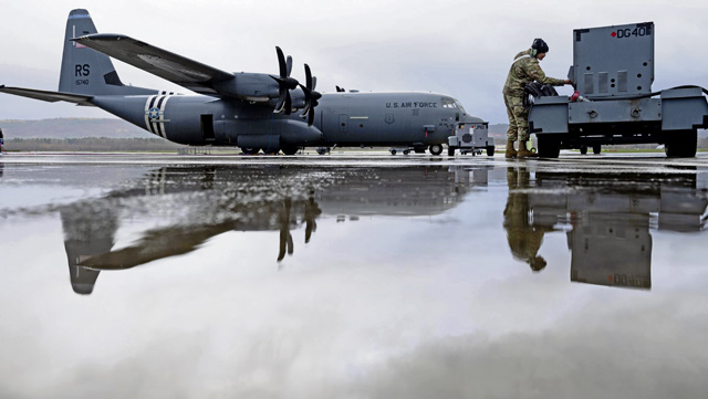 U.S. Air Force Airman 1st Class Joshua Guillory, 86th Aircraft Maintenance Squadron crew chief, activates the auxiliary power unit to help start a C-130J Super Hercules aircraft at Ramstein Air Base, Germany, Nov. 24, 2025. Airmen with the 86th Maintenance Squadron aerospace ground equipment section provided essential ground power, climate control and maintenance support, enabling the aircraft to start, function and be serviced while on the ground. (U.S. Air Force photo by Senior Airman Edgar Grimaldo)