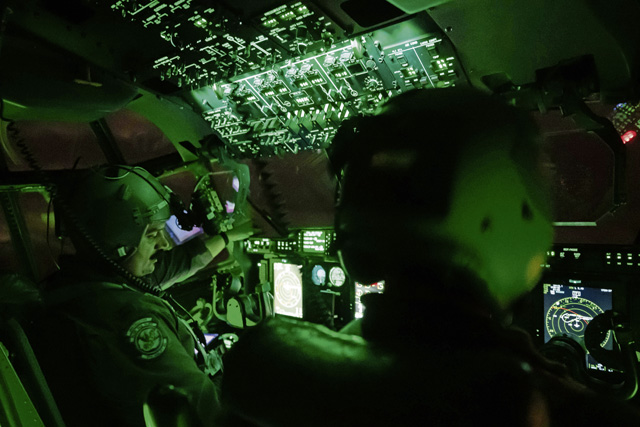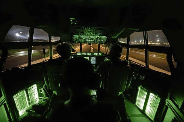 U.S. Air Force Capt. Jake Hughes, 37th Airlift Squadron instructor pilot, flies a C-130J Super Hercules aircraft with night vision goggles, while flying over Germany, Nov. 24, 2025. Flying with night vision goggles enables pilots to operate at night, which is crucial for enhancing mission flexibility, increasing stealth and improving safety in contested environments (U.S. Air Force photo by Senior Airman Edgar Grimaldo)
