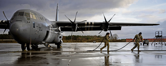 U.S. Air Force Staff Sgt. Desirae Holland, left, 37th Airlift Squadron loadmaster, and Airman 1st Class Joshua Guillory, 86th Aircraft Maintenance Squadron crew chief, disconnect a C-130J Super Hercules from the auxiliary power unit at Ramstein Air Base, Germany, Nov. 24, 2025. Airmen with the 86th Maintenance Squadron aerospace ground equipment section provided essential ground power, climate control and maintenance support, enabling the aircraft to start, function and be serviced while on the ground. (U.S. Air Force photo by Senior Airman Edgar Grimaldo)