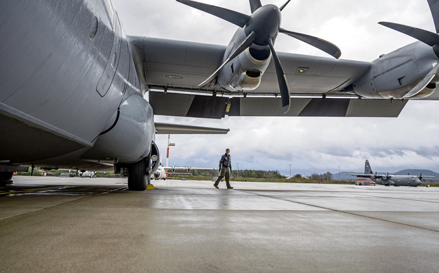 U.S. Air Force Capt. Gregg Burrow, 37th Airlift Squadron C-130J Super Hercules pilot, performs a pre-flight inspection on a C-130J aircraft at Ramstein Air Base, Germany, March 31, 2023.The purpose of the training events were to familiarize NATO allies with each country’s processes and procedures for different tactical airlift capabilities. (U.S. Air Force photo by Staff Sgt. Megan M. Beatty)