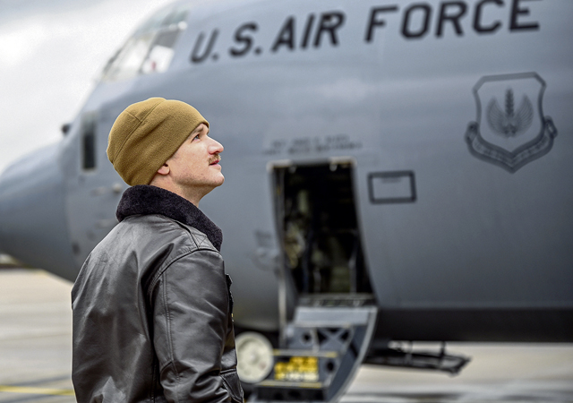 U.S. Air Force Capt. Gregg Burrow, 37th Airlift Squadron C-130J Super Hercules pilot, performs a pre-flight inspection on a C-130J aircraft at Ramstein Air Base, Germany, March 31, 2023. The 37th AS hosted NATO allies from Germany and the Netherlands to participate in a series of training events during International Interfly Week. (U.S. Air Force photo by Staff Sgt. Megan M. Beatty)