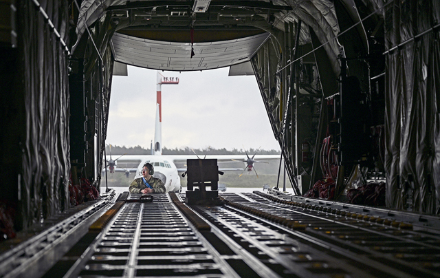 U.S. Air Force Senior Airman Donovan Elledge, 86th Aircraft Maintenance Squadron C-130J Super Hercules hydraulics journeyman, rests on the ramp of a C-130J aircraft at Ramstein Air Base, Germany, March 31, 2023. The U.S. C-130Js, German A-400M Atlas’ and Dutch air force’s C-130H Hercules practiced tactical airlift while integrating the aircraft with one another. (U.S. Air Force photo by Staff Sgt. Megan M. Beatty)