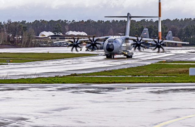 A German air force A-400M Atlas aircraft prepares for take-off at Ramstein Air Base, Germany, March 31, 2023. Training objectives for International Interfly Week included establishing standard operating procedures between various aircraft, maximizing defensive capabilities at various points of flying formations, and developing contingencies for completing airdrops in normal and adverse weather conditions. (U.S. Air Force photo by Staff Sgt. Megan M. Beatty)