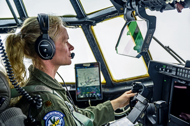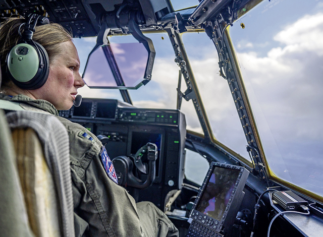 U.S. Air Force Maj. Sandra Salzman, 37th Airlift Squadron C-130J Super Hercules pilot-physician, flies a C-130J aircraft over Germany, March 31, 2023. United States forces in Europe live, train and operate with allies from across the continent to ensure a timely and coordinated response during peacetime and crisis. (U.S. Air Force photo by Staff Sgt. Megan M. Beatty)