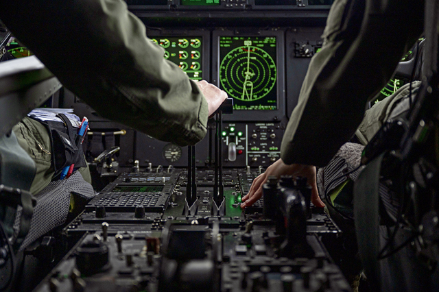 U.S. Air Force Maj. Sandra Salzman, 37th Airlift Squadron C-130J Super Hercules pilot-physician, and Capt. Megan Kraynak, 37th Airlift Squadron C-130J pilot, adjust flight controls while flying over Germany, March 31, 2023. The training events included practicing low-level routes, airdrop capabilities and practicing various formations. (U.S. Air Force photo by Staff Sgt. Megan M. Beatty)