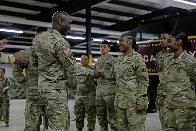 U.S. Army Command Sgt. Maj. Kofie Primus, 21st Theater Sustainment Command senior enlisted advisor, hands a Soldier a coin to recognize their excellence on Rhine Ordnance Barracks, Kaiserslautern, Germany, February 8, 2023. The ceremony was held due to recognize the 39th MCB for their efforts across the Army. (U.S. Army photo by Spc. Samuel Signor)