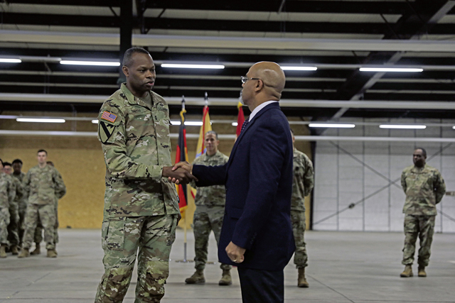 U.S. Army Maj. Gen. James M. Smith, Commanding General of the 21st Theater Sustainment Command, shakes hands with Alvin Jones, United States Army, Europe and Africa sustainment assistance review team chief, after recognizing him for his help with an award ceremony that was held on Rhine Ordnance Barracks, Kaiserslautern, Germany, on February 8, 2023. The ceremony was held for the 39th Movement Control Battalion being recognized for their efforts across the Army. (U.S. Army photo by Spc. Samuel Signor)