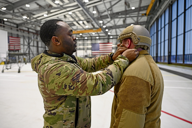 U.S. Air Force Tech. Sgt. Ezekiel Burke, 435th Air Ground Operations Wing Safety occupational safety manager, performs a safety check for Capt. Corey McGlynn, 435th AGOW executive officer, before members of the wing conduct static line jumps, at Ramstein Air Base. Burke is one half of the 435 AGOW Safety Office that was awarded 2025 United States Air Forces in Europe-United States Air Forces Africa Chief of Safety Outstanding Achievement Award Category IV, an award recognizing the most effective safety program. Photo by Capt. Amber R. Kelly-Herard