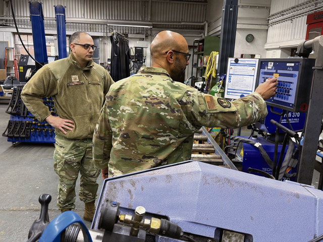 U.S. Air Force Master Sgt. William Parisse, 435th AGOW Safety superintendent, performs a safety inspection on an emergency shut-off switch with Master Sgt. Michael Moore, 435th Construction and Training Squadron Transportation Flight superintendent, at Ramstein Air Base. Parisse is one half of the 435 AGOW Safety Office that was awarded 2025 United States Air Forces in Europe-United States Air Forces Africa Chief of Safety Outstanding Achievement Award Category IV, an award recognizing the most effective safety program. Courtesy photo
