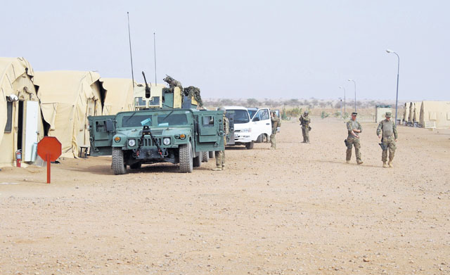 Airmen walk down the main strip of a newly established base April 27 in Africa. The mission of the 435th Contingency Response Group is to construct bases out of bare strips of land. This deployment showcased the CRGs capabilities.
