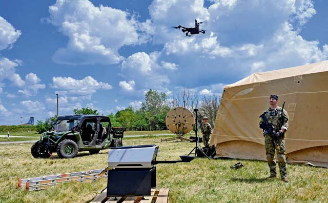 U.S. Air Force Airmen, from the 435th Contingency Response Element, watch a drone automatically return to its launch platform during exercise Swift Response 24, at Kecskemet Air Base, Hungary, May 10. SR24 is a joint exercise that enables members of NATO to build strong partnerships and test new technology.