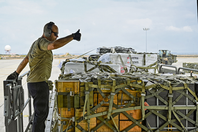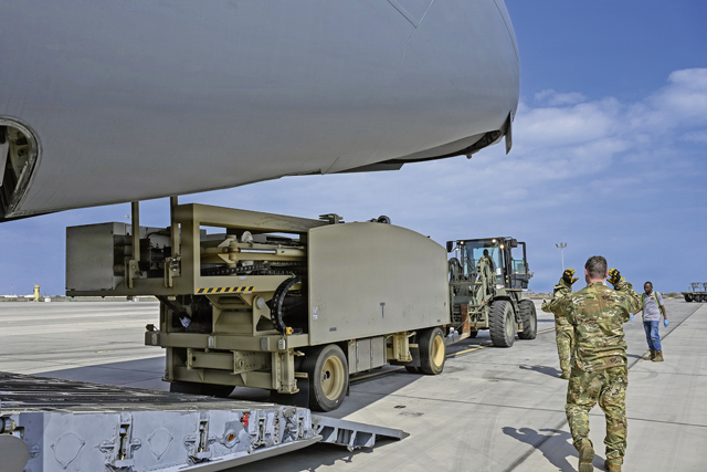 U.S. Air Force Staff Sgt. Alexander Blankenship, 449th Air Expeditionary Group Logistics Operations Cell air transportation noncommissioned officer in charge, helps offload cargo from a C-17 Globemaster III cargo aircraft at Camp Lemonnier, Djibouti, Jan. 11, 2025. Offloading operations ensure the timely distribution of equipment and supplies in support of ongoing missions across the U.S. Africa Command area of responsibility. (U.S. Air Force photo by Senior Airman Carl Good)