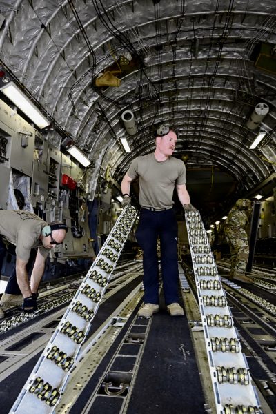 U.S. Air Force Tech. Sgt. Jacob Dietz, 449th Air Expeditionary Group Logistics Operations Cell superintendent, positions roller tracks inside a C-17 Globemaster III cargo aircraft at Camp Lemonnier, Djibouti, Jan. 11, 2025. Proper placement of cargo handling equipment enables rapid loading and unloading operations, enhancing mission readiness and logistical efficiency. (U.S. Air Force photo by Senior Airman Carl Good)