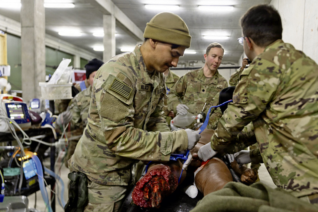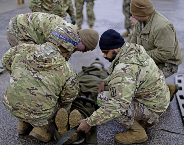 U.S. Army Soldiers assigned to 512th Field Hospital, 30th Medical Brigade, 21st Theater Sustainment Command treat a simulated casualty during a field training exercise on Rhine Ordnance Barracks, Kaiserslautern, Germany, Feb. 4, 2026. The exercise demonstrates an alternate casualty evacuation method to a local mobile health center. (U.S. Army photo by Pvt. Robert Palmer)